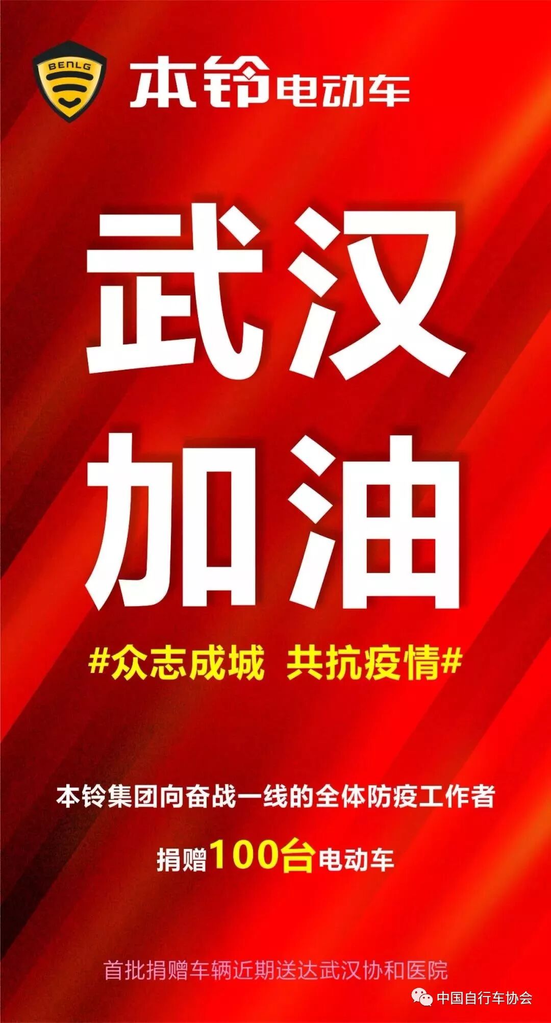 疫情无情人有情,一方有难八方支援。疫情爆发后,本铃集团领导高度关注疫情的发展动态,为支持湖北抗击新型冠状病毒感染的肺炎行动,向奋战一线的全体医务人员及防疫工作者致敬,本铃集团启动支援武汉行动,决定向武汉各大定点抗疫医院捐赠100台电动车,用以支持武汉医护人员安全方便出行,希望能通过绵薄之力,和全国人民一起抗击疫情,共渡难关。