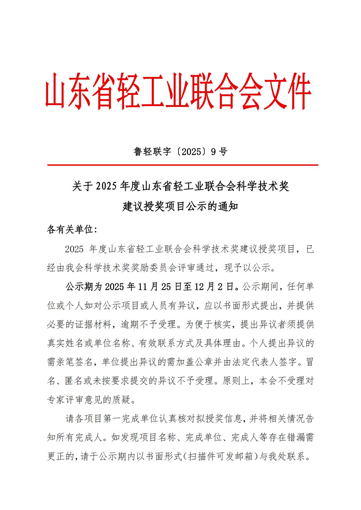 关于 2025 年度山东省轻工业联合会科学技术奖 建议授奖项目公示的通知